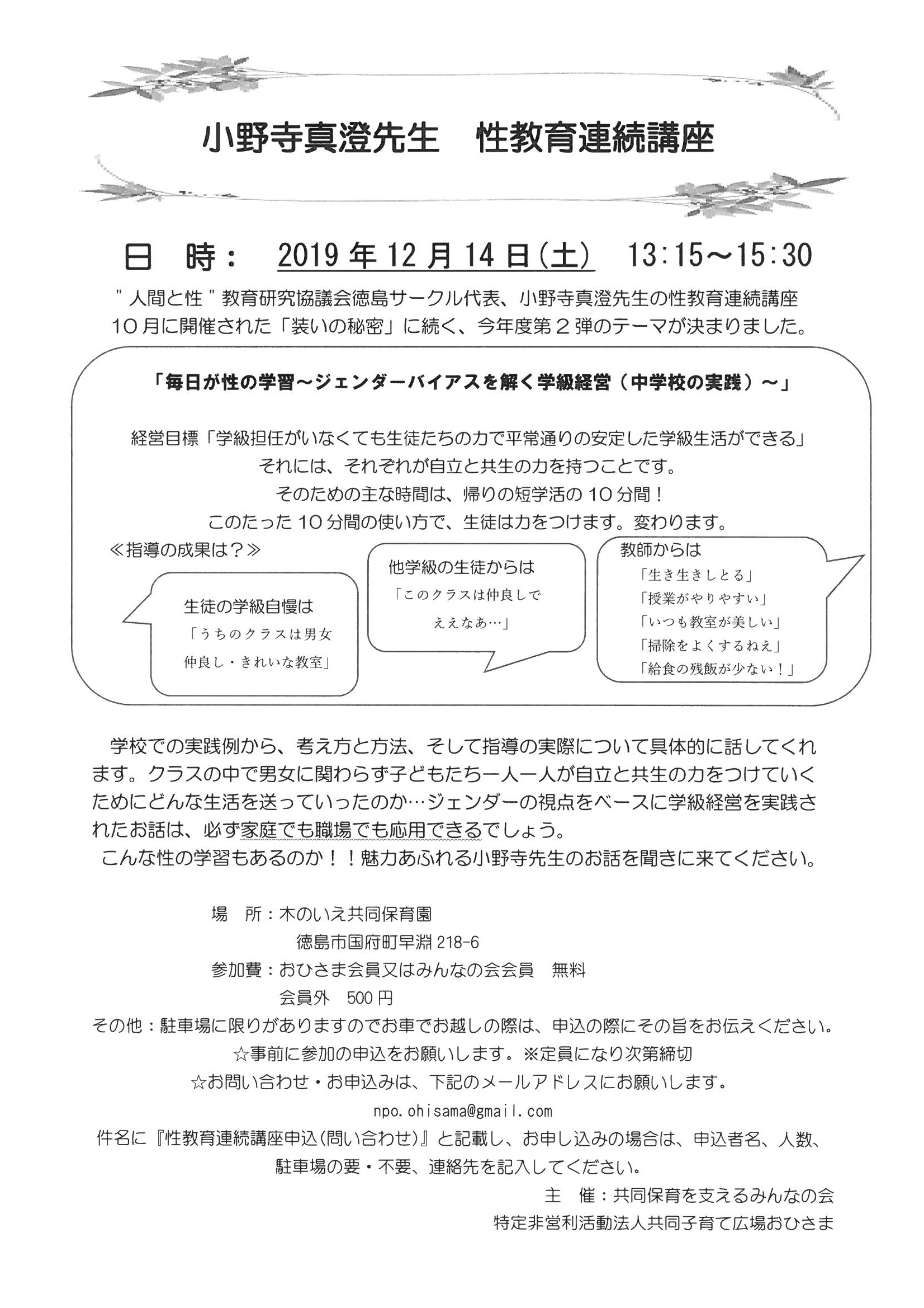 小野寺真澄先生 第2弾性教育連続講座のお知らせ